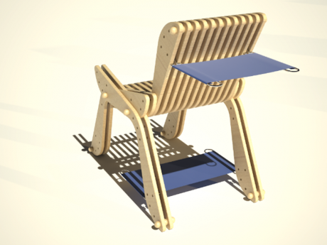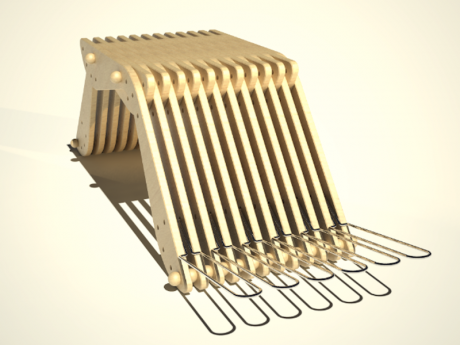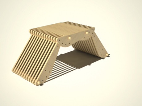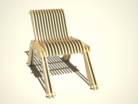 Accogliendo pertanto le istanze di un abitare sostenibile, la giovane progettista ha ritenuto di puntare su un concetto di massima standardizzazione, arrivando a definire un unico componente realizzato in multistrato di betulla, che con un determinato profilo provvisto di 14 forature e con distanziali sferici sempre in legno, consente di essere assemblato con diverse angolazioni per configurare una completa linea di arredo.